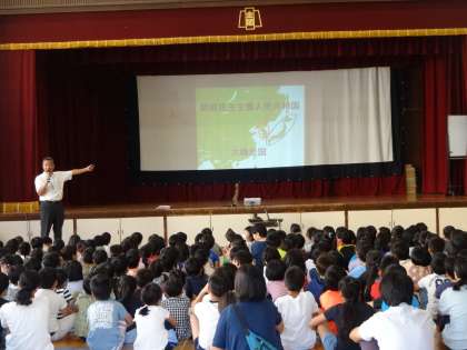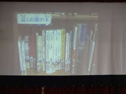 校長先生からは、お隣の国「朝鮮」についてお話がありました。似ている言葉がたくさんあることや、学校図書館にたくさんの「近くの国」についての本があることなどをおしえていただきました。