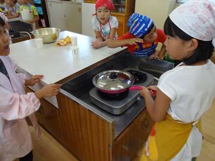 みんなで協力してフライパンを順番にゆらしました。音がポンポンとし出すと,子どもたちは,「待っていました!」という思いで,うれしくて「なっている。」と報告してくれていました。