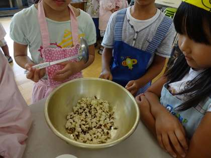 出来上がって,ポップコーンをみんなでおいしく食べました。