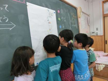 スーパーマーケットで売られている商品はどこからきているのか,チラシを見て調べました。調べた結果を地図にシールを貼ってまとめていくと,日本だけでなく,世界中から商品がきていることに気が付くことができました。