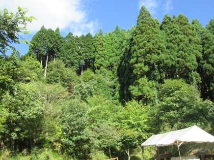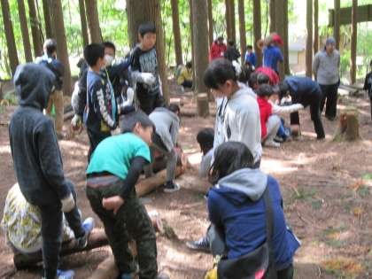 青空が気持ちいいです。林の中で林業体験を行っています。グループのみんなで励まし合って,のこぎりを引いていました。途中で応援の歌を歌い始めるグループも!とても仲良しです!!