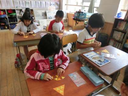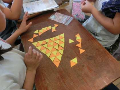 小さな正三角形をしきつめて,グループで力を合わせて大きな正三角形を作ったり,ほかの形を作ったりすることができました。