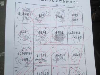 今日の午前中のプログラムは「ネイチャービンゴ」です。ビンゴシートに書かれている自然を見つけながら、山の家の敷地内を散策します。木の実やきのこや松ぼっくりなど、たくさんの秋を見つけました。