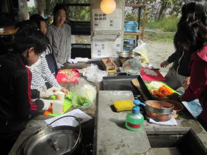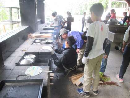 今日の昼食は野外炊事【バイキング】です。メニューは、豚汁、ハヤシライス、すき焼き風煮、焼きそばです。野外炊事も2回目なので、準備も手際よくすすんでいきます。