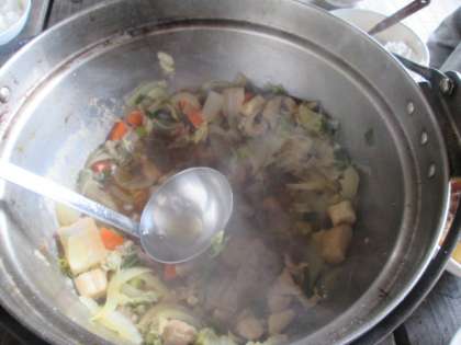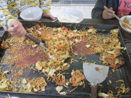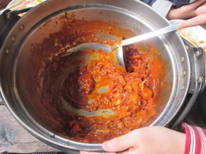 いろんな料理のおいしそうなにおいがただよってきました。においだけでなく、どの料理もとってもおいしいです。自分たちが作った料理も、ほかのグループが作ってくれた料理も。あっという間に、鍋の中はからっぽになりました。野外炊事、大成功!!