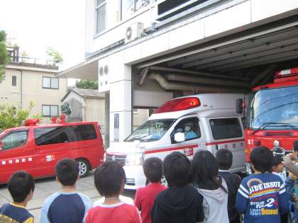 見学していた最中にも救急車の出動要請があり,出動していくのを見守りました。子どもたちはその様子を目の当たりにして,気の抜けない仕事だと実感したようでした。