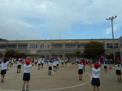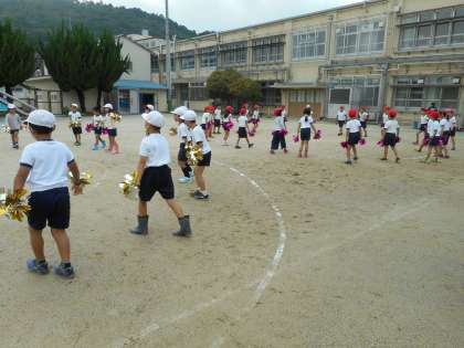 朝からの雨で今日の練習は,中止かと心配しましたが,お昼から雨も上がり6校時の体育はなんとかグランドで練習することができました。今日は,ダンスで使うポンポンを初めて持って練習しました。だんだんと本番に近い練習をする度に子どもたちの気分は少しずつ盛り上がっているように見えます。