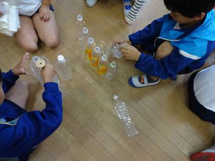 生活科「あそんで ためして くふうして」の学習では,家庭で廃棄される物(ペットボトル・トレー・空き箱など)を利用して楽しい遊びを自分たちで考えていきます。今日は,その1回目でいろいろなものを使ってどんな遊びが考えられるのかグループで試してみました。次回も他の物を使って考えてみようと計画しています。
