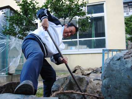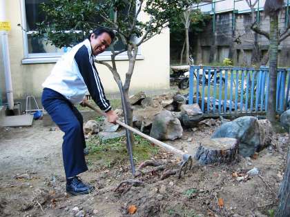 そこで,今回「滝」の石垣を分割し地面を均して,観察用のビオトープを作ることにしました。