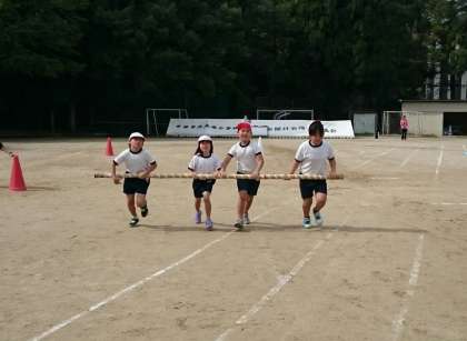 3年生の団体競技は「台風の目」。4人で1本の棒を持ち走ります。にじの子学級の3人の3年生も,友だちと力を合わせて練習しています。プログラムが配られると「台風の目は何番目かな・・?」とわくわくしながら探していました。