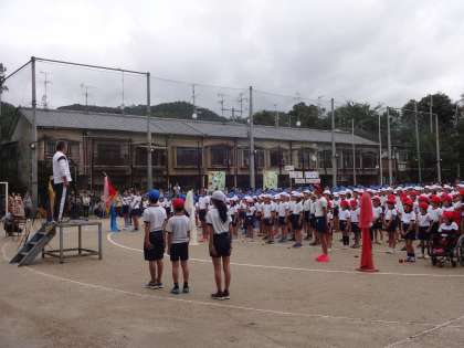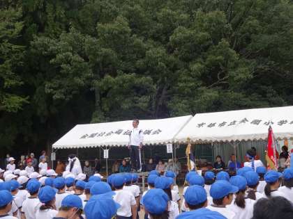 まず、3色にわかれた児童が入場行進をして入場し、開会式を行いました。