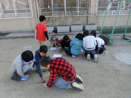 温度計を使って,日向と日がげの地面の温度を時刻をかえて調べました。初めて温度計を使いましたが,正しく温度計の目盛を読むことができました。