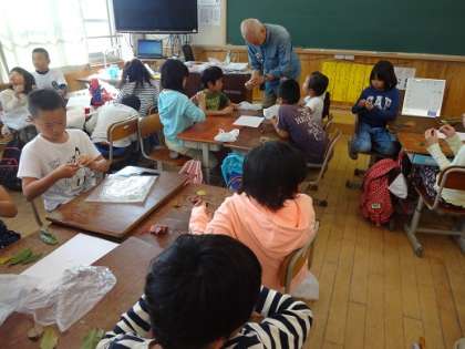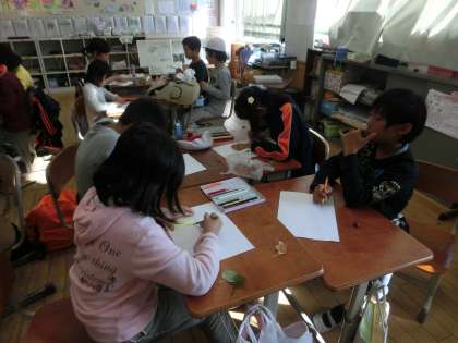 衣笠山で見つけた葉やドングリを使って,「落ち葉のこすりだし」と「ドングリのキーホルダーづくり」をしました。友達が見つけた葉と交換し合いながら,いろいろな葉をこすりだしたり,ドングリに顔を描いたりして,自然のものに親しむことができました。できたものを大切そうに友達に見せ合っていました。