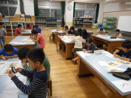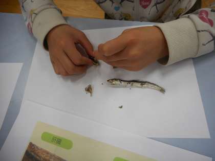 魚の解剖をしました。解剖したのは「にぼし」です。指でにぼしを開き,資料を参考にしながら,脳・えら・心臓・腸・卵巣(精巣)などを確認していきました。楽しい「魚の解剖」でした。