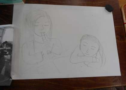 6年生の図工「版画」テーマは『版から広がる世界』です。友達と2人で,腕相撲をしたり将棋をしたり,本を読んだりピアノを弾いたりしている姿を版画で表します。