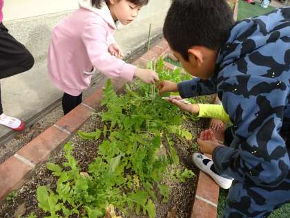 生活科で育てている大根の葉にアオムシがついて,たくさん葉が食べられてしまいました。今日の水やり当番の人達で,そのアオムシをとって,違う場所に移動させました。大根の葉がずいぶん食べられてしまい,大根ができるか少し心配です。