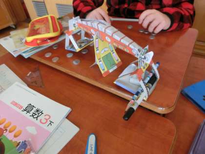 自分で作ったてんびんを使って文房具の重さが1円玉何個分になるのか調べました。鉛筆や消しゴム,定規などいろいろなものの重さを調べることができました。手作りのてんびんでは,重いものを測ることはできなかったので,次は重いものの測り方について学習していきます。