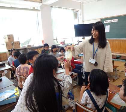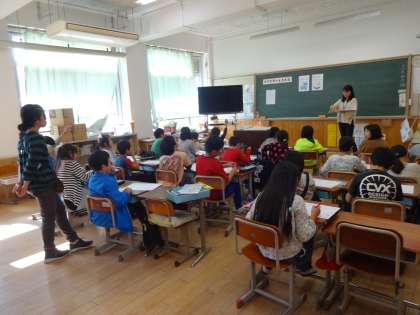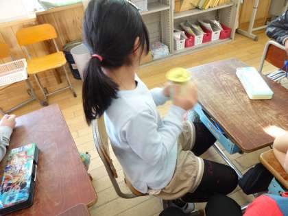 本日の3校時に、栄養教諭の福井先生が、食の指導を行いました。「姿をかえる牛乳」という学習で、バターを作りました。