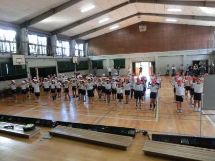 初めに,準備運動として,運動会の全校ダンスを保護者の方と一緒にみんなで踊りました。
