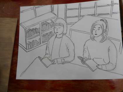 刷り上がりをイメージして,下絵を描き,彫り進めます。