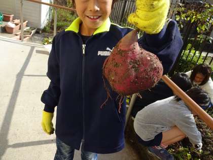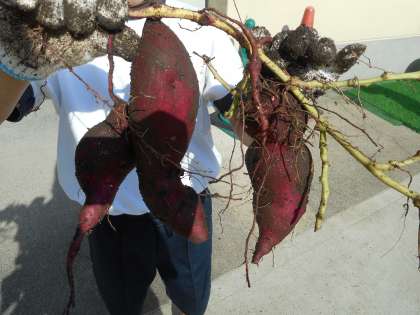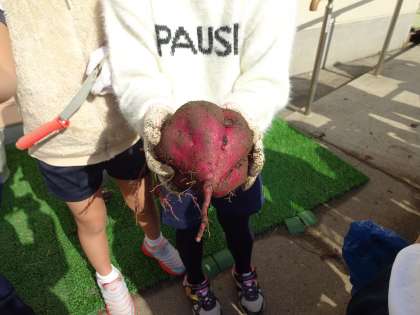 どんないもが取れるのか楽しみにしていた子どもたちは,掘り上げるたびに報告してくれていました。とても大きないもやたくさん付いているいもが掘り上げられる度に,大喜びで報告してくれていました。