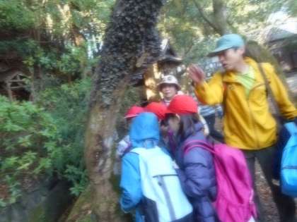 今日は,京都森林インストラクター会の方々に案内していただきながら衣笠山を散策し,身近な自然に触れる学習をしました。朝方はとても寒かったのですが,出発した時は,とてもあたたかくて良いお天気でした!