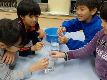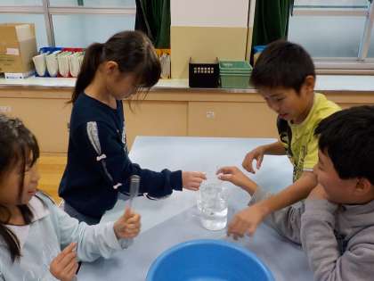 空気を温めたり冷やしたりした時に,体積がどのように変化するかを調べました。自分たちの予想したことが本当なのかどうか,子どもたちはわくわくしながら実験していました。試験管の口につけた石けん水のまくが,どのように変化するか目をこらして見て,実験した後は考察をすることができました。