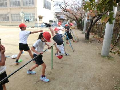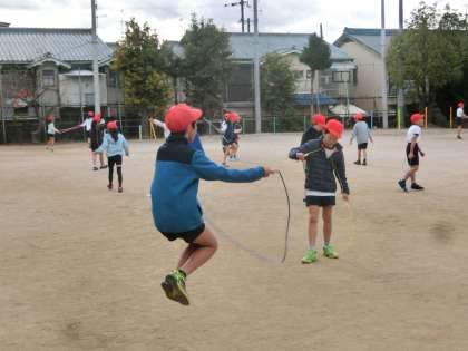 寒空の下,元気に体を動かしました。はじめは「寒い寒い」と縮こまっていた子どもたちも,縄跳びをしているうちに温まってきたようです。楽しく運動し,がんばっていました。鉄棒も,逆上がりのコツを知り,繰り返しチャレンジしていました。