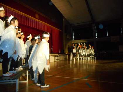 講堂で本番のようにライトを当てて、衣装を身に着けて演技をしました。