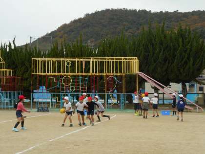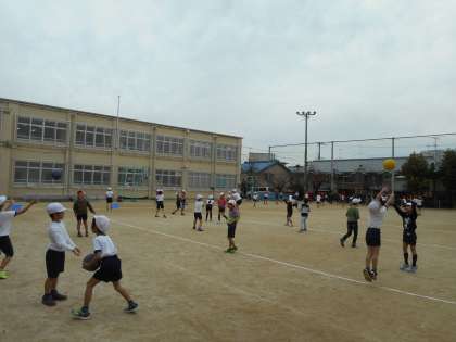 3,4時間目にパスゲームをしました。上から投げたり、パスを繋げたりする練習をしました。譲り合って楽しくゲームが出来ました。