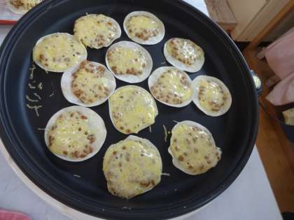 2 餃子の皮に納豆をのせ,ピザ用チーズをかけます。