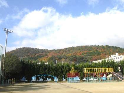 運動場から見える衣笠山の紅葉がとってもきれいです。東門の外、きぬかけの道の傍らの紅葉も、かなり色づいてきました。錦秋の装いです。