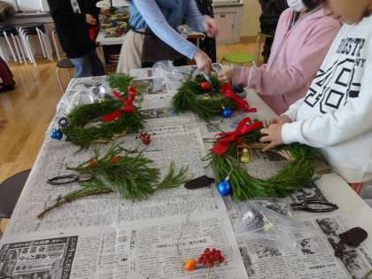 本日のいけばな教室では、フジツル、キューイのツル、北山杉、サツマ杉、カラスウリ、キライの実、サンシユウの実を使い、クリスマスのリースを作りました。