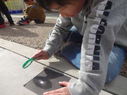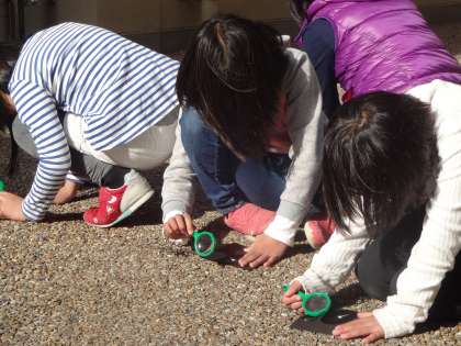 理科の学習で、虫めがねを使って、太陽の光を集めると、どうなるのかを実験しました。実験を始めてしばらくすると、けむりが出てきてみんな驚いていました。