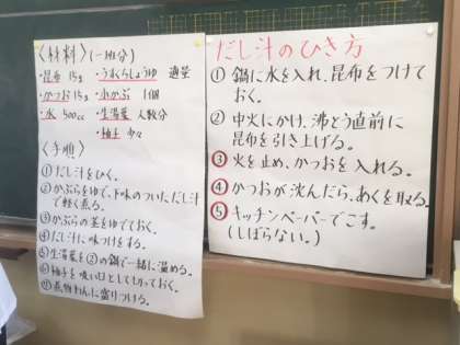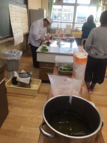 早朝より石川様をはじめアシスタントの皆様がご来校し、準備をされています。家庭科室中に、だしとゆずのとてもいい香りが広がっています。