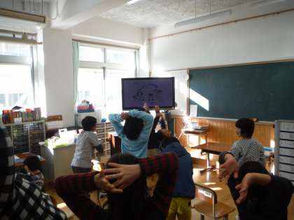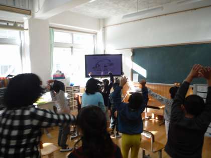 片足バランスに続き,毎朝行っている「姿勢体そう」。「さんぽ」の曲に合わせて動きます。最近では,大分覚えてできるようになってきました。腕を上にしっかりあげたり,肩をまわしたりして,身体がとっても気持ちよくなります。身体の調子を整えて,1日のスタートです。