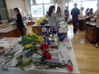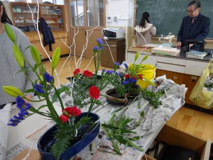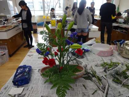 カーネーション、スターチス、スカシユリ、レザーファン、雲竜柳を生けました。