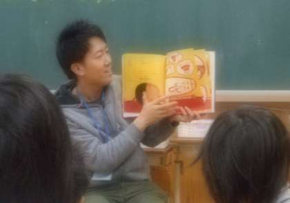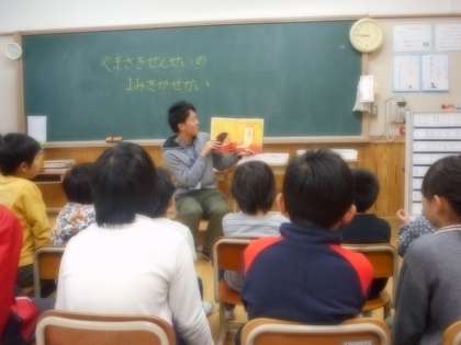 今日の朝読書は,教師が教室を移動し担任ではない教員が読み聞かせをしました。にじのこ学級には5年生の先生が来てくだいました。本の題名はずばり「おならまんざい」。にじのこ学級の子どもたちに大人気の長谷川義史さんの絵本です。題名から想像できる通り楽しいお話で,くすくす,時に大笑いしながら,とっても集中して聞いていました。