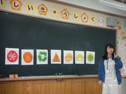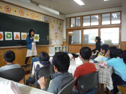 ランチルームで,栄養教諭の先生に野菜の栄養について教えていただきました。野菜の断面(やさいのおなか)の絵から何の野菜か考えるクイズのあと,色の濃い野菜と薄い野菜の栄養の違い,見分け方は野菜のおなか(断面)の色であることなどが分かりました。「やさいのおなか」のクイズでは,第1ヒントの白黒の絵から興味津々で,どんどん手を挙げて発表していました。学習のお後は,ランチルームで楽しく給食をいただきました。