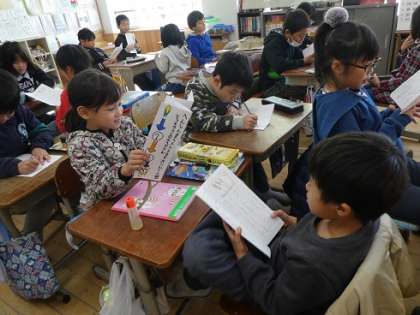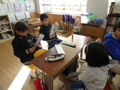 自分が調べた,食べ物のひみつについて「へんしん!へんしん!大へんしん!!カード」にまとめたので,カードを読み合い感想を交流しました。友達のカードを熱心に見ながら,友達の説明文の良さをたくさんみつけて感想を書くことができました。