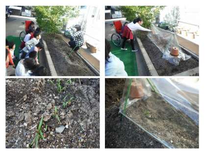 12月に種をまいたホウレンソウとニンジンの芽が出ました。寒くてもう出ないのかなあと心配していたので,とてもうれしいです。でも今日はとっても寒いので,ビニールをかけました。大きくなるようにみんなで「がんばってー!」と声をかけました。