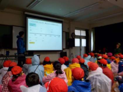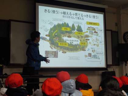 京都森林インストラクター会のみなさんがお越しくださり,森林教室を行いました。昨年度,3年生の時に設置した鳥の巣箱の回収に行きました。まずはパワーポイントを使って,衣笠山にいる生き物の紹介や森林の役割などについて,お話して下さいました。