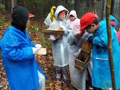 そしていよいよ,巣箱はずしの時間です。ドキドキしながら巣箱の中をのぞく子どもたち。残念ながら鳥は巣箱に入っていませんでしたが,様々な虫が住み着いている様子が見られました。