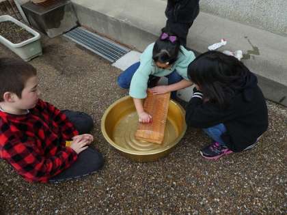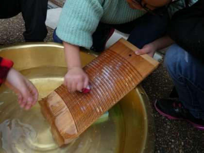 社会科の学習で,昔の道具の「洗濯板」を使って自分の靴下を洗濯しました。始めにせっけんを洗濯板にこすり付けて泡立ててから洗うと,汚れがよく落ちるよ。」など,使う中で「使い方」や「昔の人の工夫」について考えることができました。1足の靴下を洗うのに20分かかったことから,「家族全員分を洗うには何時間かかるのかな。昔の人は大変じゃなかったのかな。」と昔の人の思いを想像することができました。