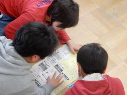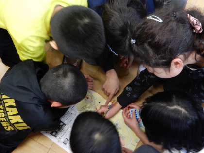 はばたき学習で、金閣校区の工夫を「人にやさしい」「環境にやさしい」という2つの視点て地図にシールで表しました。意見を交わしながらグループで協力して活動できました。