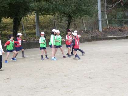 練習していくうちに,相手の動きを見ながらパスを上手に回すことができるようになってきました。「こっちに動いて」「ナイスパス」など,チームで声を掛けあいながら楽しく活動しています。