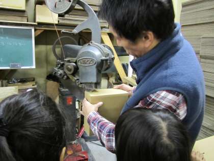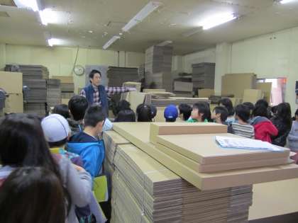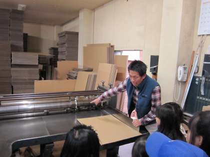 朝日紙器さんでは段ボール箱が出来上がるまでを見させていただき,職人さんの技に子どもたちもとっても驚いていました。