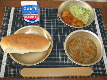 毎週水曜日はパンの日です。コッペパンにソーセージのトマト煮をはさんでサンドイッチにして食べる献立でした。今日は,子どもたちに大人気でほとんど残菜がなくきれいに食べている様子でした。