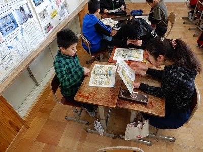 外国語活動で教科書を見ながら問題を出し合いました。問題を出し合う中で,新しく知った英語表現もたくさん発音することができました。