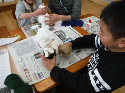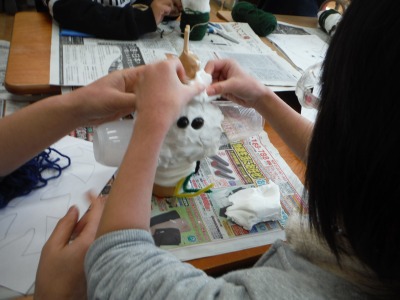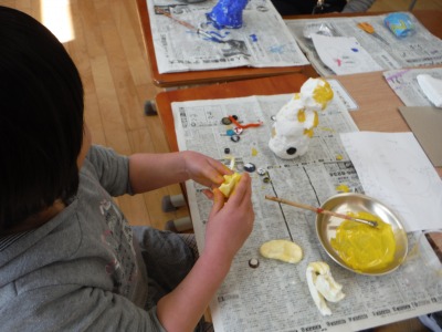 小さな巨匠展のおばけの世界に登場する,自分だけの「○○おばけ」を作っています。紙粘土,液体粘土,ボタン,リボン,毛糸,ペットボトル,缶,綿,・・・などなど,いろいろな素材の中から,自分のおばけに合うものを選んで作っています。